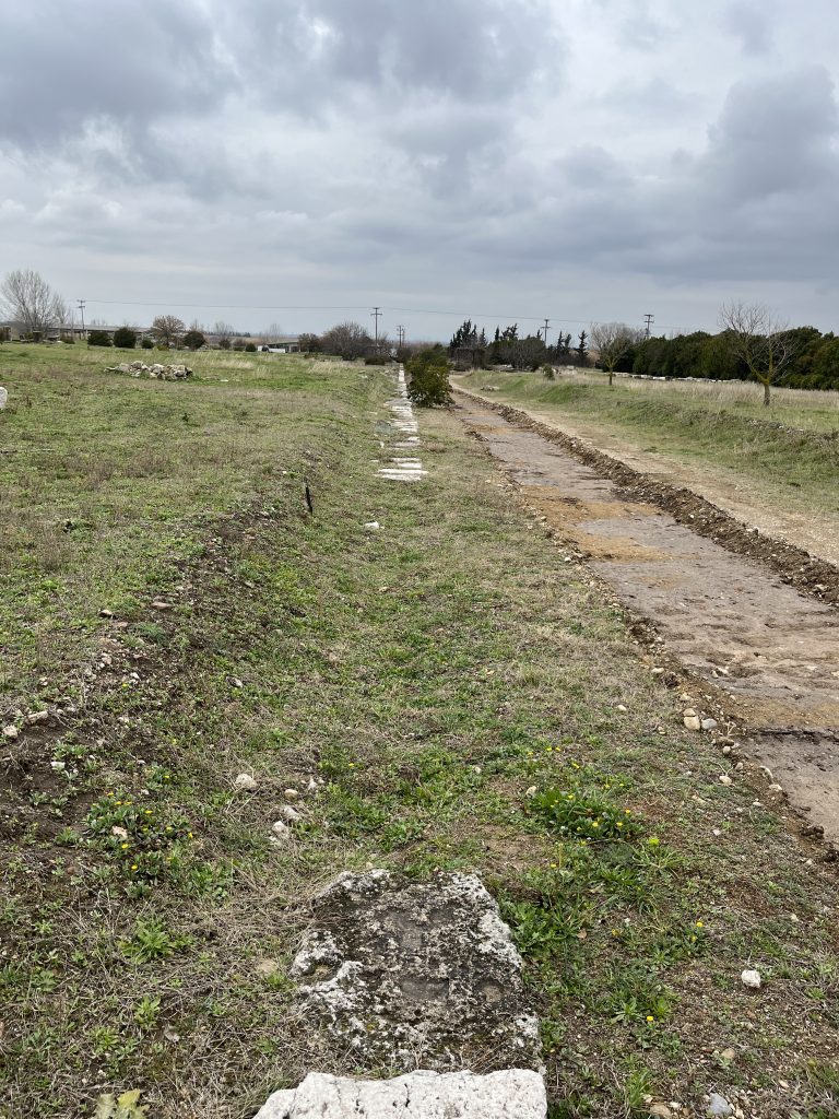 From the village of Chalkidona onwards, the route is more certain. About 1.6 km after the highway exits that village, a series of four Macedonian tombs flank the modern highway at 1-kilometre intervals. Shortly after the final tomb, according to a map displayed in the Pella Archaeological Museum, the VE veered northwest to pass southwest of a multi-chambered tomb. It turned due west 150 m later and ran directly for a final 700 m to the eastern entrance of Pella’s Hellenistic agora. It then continued across its center and out the western side. M. Akamatis calls it “a majestic avenue, fully 15 m across and the largest of the city’s streets,”3 and thus is most likely the VE. Both a first-century BC earthquake and the re-founding of the city as a Roman colony would have entailed extensive changes to the city plan which in turn may have altered the route of the VE through the city.