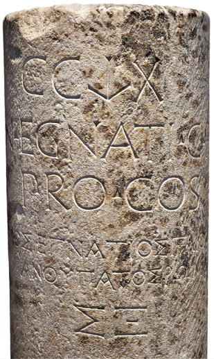 1. CIL I2 2977 = AE 1973, 492 = AE 1976, 643. The text reads Gn(aeus) Egnati(us) G(aius) f(ilius)/Pro.co(n)s(ul)/ Γναῖος Ἐγνάτιος Γάϊου ἀνθύπατος Ῥωμαίων. The stone is now in the Archaeology Museum of Thessaloniki (MΘ 6932; see Romiopoulou, Catherine. “Un Nouveau Milliaire de La Via Egnatia.” Bulletin de correspondance hellénique 98, no. 2 (1974): 813, n. 1. ↩︎